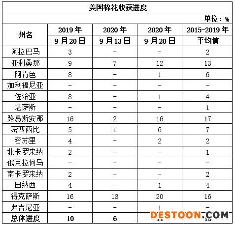 美國(guó)農(nóng)業(yè)部9月21日發(fā)布的美國(guó)棉花生產(chǎn)報(bào)告顯示,截至2020年9月20日,美國(guó)棉花吐絮進(jìn)度為57%,比去年同期減少4個(gè)百分點(diǎn),比過去五年平均值增加2個(gè)百分點(diǎn)。美國(guó)棉花收獲進(jìn)度為11%,比去年同期增加1個(gè)百分點(diǎn),較過去五年平均值增加1個(gè)百分點(diǎn)。美國(guó)棉花生長(zhǎng)狀況達(dá)到良好以上的占45%,與前周持平,較去年同期增加5個(gè)百分點(diǎn)。