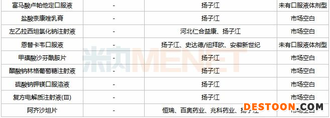 11個(gè)品種由揚(yáng)子江首家或獨(dú)家以新分類報(bào)產(chǎn),獲得首仿的幾率比較大。其中氫溴酸伏硫西汀片、鹽酸右美托咪定氯化鈉注射液、恩替卡韋口服液3個(gè)品種由揚(yáng)子江首家以新分類報(bào)產(chǎn);注射用磷酸特地唑胺、鹽酸達(dá)拉他韋片、富馬酸盧帕他定口服液、鹽酸奈康唑乳膏、甲磺酸沙芬酰胺片、復(fù)方電解質(zhì)注射液(Ⅲ)、醋酸鈉林格葡萄糖注射液、硫酸鈉鉀鎂口服溶液8個(gè)品種由揚(yáng)子江獨(dú)家以新分類報(bào)產(chǎn)。