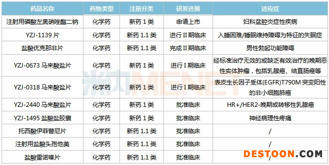 YZJ-1139片是食欲素1和2型雙重受體的高效拮抗劑,通過抑制食欲素受體從而改善睡眠,目前正在進(jìn)行II期臨床;鹽酸優(yōu)克那非片是一款PDE-5抑制劑,由吉林大學(xué)研發(fā),天士力申報(bào)臨床,揚(yáng)子江開展臨床研究,目前已完成治療勃起功能障礙的II期臨床,9月17日揚(yáng)子江提交該新藥補(bǔ)充申請(qǐng)獲得CDE承辦受理;YZJ-0673馬來酸鹽片是一種泛PI3K抑制劑,國內(nèi)尚無同靶點(diǎn)藥物獲批上市,揚(yáng)子江的產(chǎn)品正在進(jìn)行I期臨床,用于晚期惡性實(shí)體腫瘤;YZJ-0318馬來酸鹽片為第三代表皮生長因子(EGFR-TKI)受體抑制劑,能夠選擇性的抑制T790M耐藥突變,目前正在開展I期臨床。