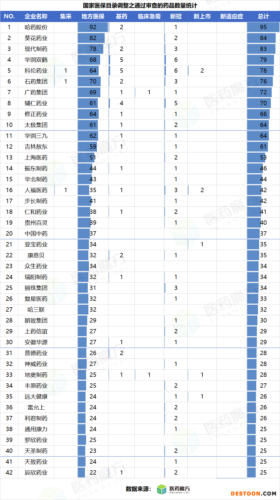 醫(yī)藥魔方的數(shù)據(jù)顯示,哈藥股份、葵花藥業(yè)、現(xiàn)代制藥、華潤雙鶴、科倫藥業(yè)、石藥集團、廣藥集團、輔仁藥業(yè)、修正藥業(yè)、太極集團、華潤三九等42家藥企通過國家醫(yī)保目錄調(diào)整形式審查的藥品數(shù)量較多。