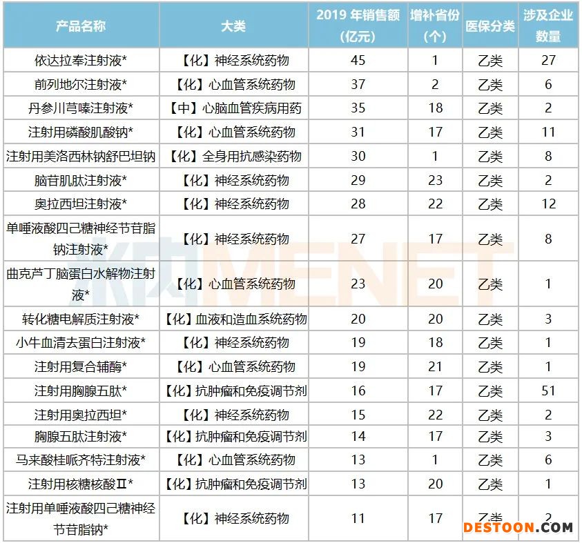 注射用環(huán)磷腺苷葡胺用于心力衰竭、心肌炎、病竇綜合征、冠心病及心肌病,可用于心律失常的輔助治療。該產(chǎn)品2016年在中國公立醫(yī)療機(jī)構(gòu)終端銷售額突破19億元,隨后在2017年急降至15億元,2018-2019年以2.81%、3.28%的增速緩慢回升,2019年銷售額接近16億元,目前在執(zhí)行的省級(jí)醫(yī)保目錄有7個(gè)。從企業(yè)競(jìng)爭情況來看,瑞陽制藥占半壁江山,無錫凱夫制藥市場(chǎng)份額也超過30%。值得注意的是,該產(chǎn)品早前曾進(jìn)入四川、青島、內(nèi)蒙古等地的重點(diǎn)監(jiān)控目錄,若本次順利進(jìn)入國家醫(yī)保,“黑歷史”將被洗白。