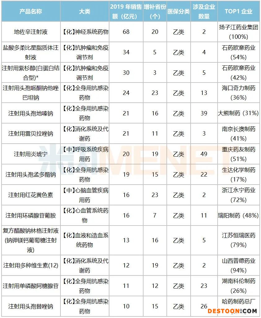 此外,注射用美洛西林鈉舒巴坦鈉2019年在中國公立醫(yī)療機(jī)構(gòu)終端銷售額接近30億元,獲得批文的企業(yè)達(dá)8家,僅進(jìn)入了浙江省醫(yī)保目錄,預(yù)計(jì)不進(jìn)入國家醫(yī)保,對(duì)其銷售影響也不大。