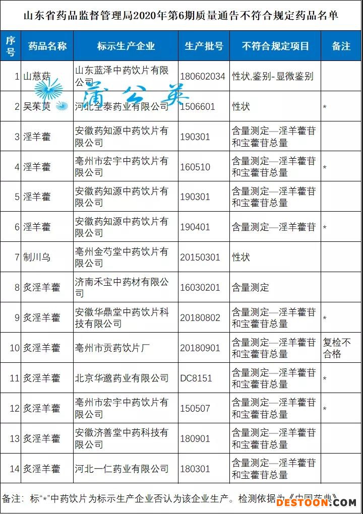 9月28日訊 9月25日,山東省藥品監(jiān)督管理局藥品質(zhì)量抽檢通告(2020年第6期) 。通告顯示,共有11家生產(chǎn)企業(yè)的5個品種共14批次藥品抽檢不合格;相關(guān)藥品監(jiān)管部門對不符合規(guī)定產(chǎn)品已采取查封、扣押、暫停銷售、產(chǎn)品召回等控制措施,并依據(jù)相關(guān)法律法規(guī)對有關(guān)生產(chǎn)企業(yè)(配制單位)、被抽樣單位依法嚴肅查處。
