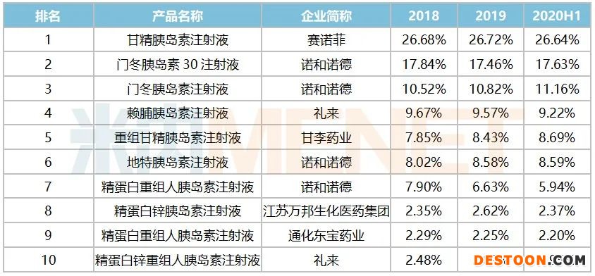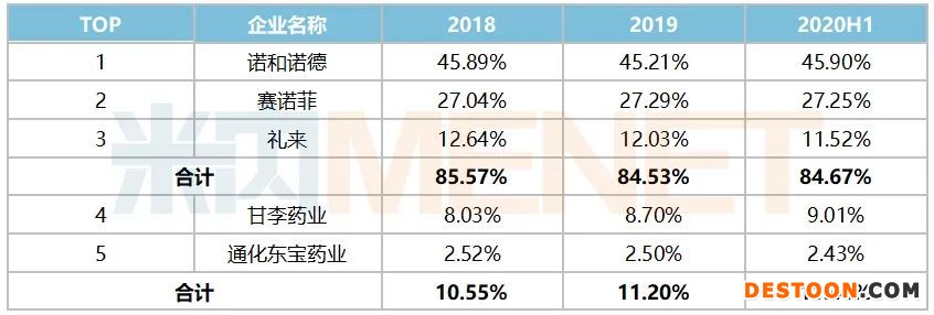 表1:胰島素及類似藥TOP5企業(yè)的份額變化情況
