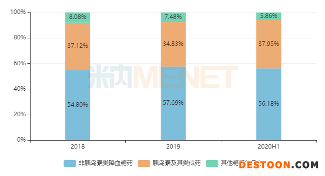 米內(nèi)網(wǎng)數(shù)據(jù)顯示,最近幾年在重點(diǎn)省市公立醫(yī)院終端,非胰島素類降血糖藥依然是糖尿病用藥的主力,但胰島素及類似藥的市場(chǎng)份額也在逐漸上漲。2020上半年受疫情影響,患者到醫(yī)院就診的頻率下滑,但該小類的市場(chǎng)份額依然樂(lè)觀,占比上漲至38%左右。