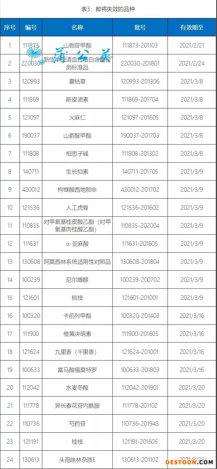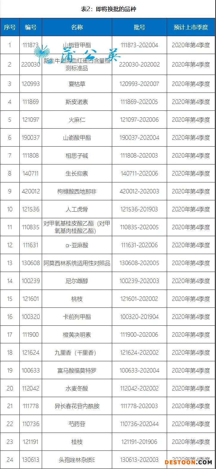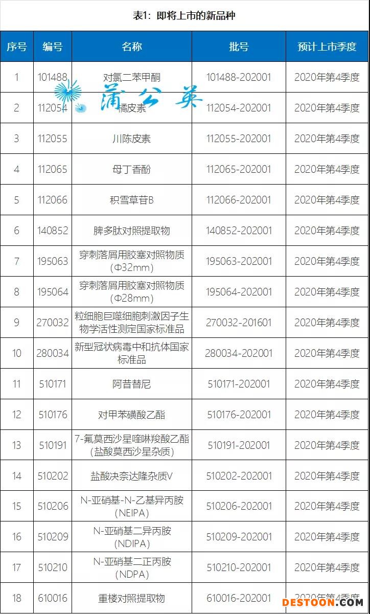 現(xiàn)發(fā)布2020年第十期國家藥品標(biāo)準(zhǔn)物質(zhì)供應(yīng)新情況,包括18個(gè)即將上市的新品種,24個(gè)即將換批品種的預(yù)計(jì)上市時(shí)間,24個(gè)即將失效品種的有效使用期限和4個(gè)停用品種名單,詳見表1、表2、表3和表4。