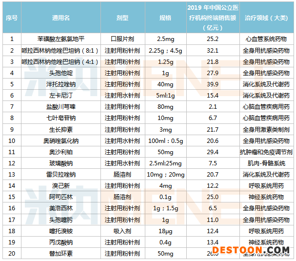 米內網(wǎng)數(shù)據(jù)顯示,20個品種(23個品規(guī))2019年在中國城市公立醫(yī)院、縣級公立醫(yī)院、城市社區(qū)中心以及鄉(xiāng)鎮(zhèn)衛(wèi)生院(簡稱中國公立醫(yī)療機構)終端銷售額超過10億元的有16個。