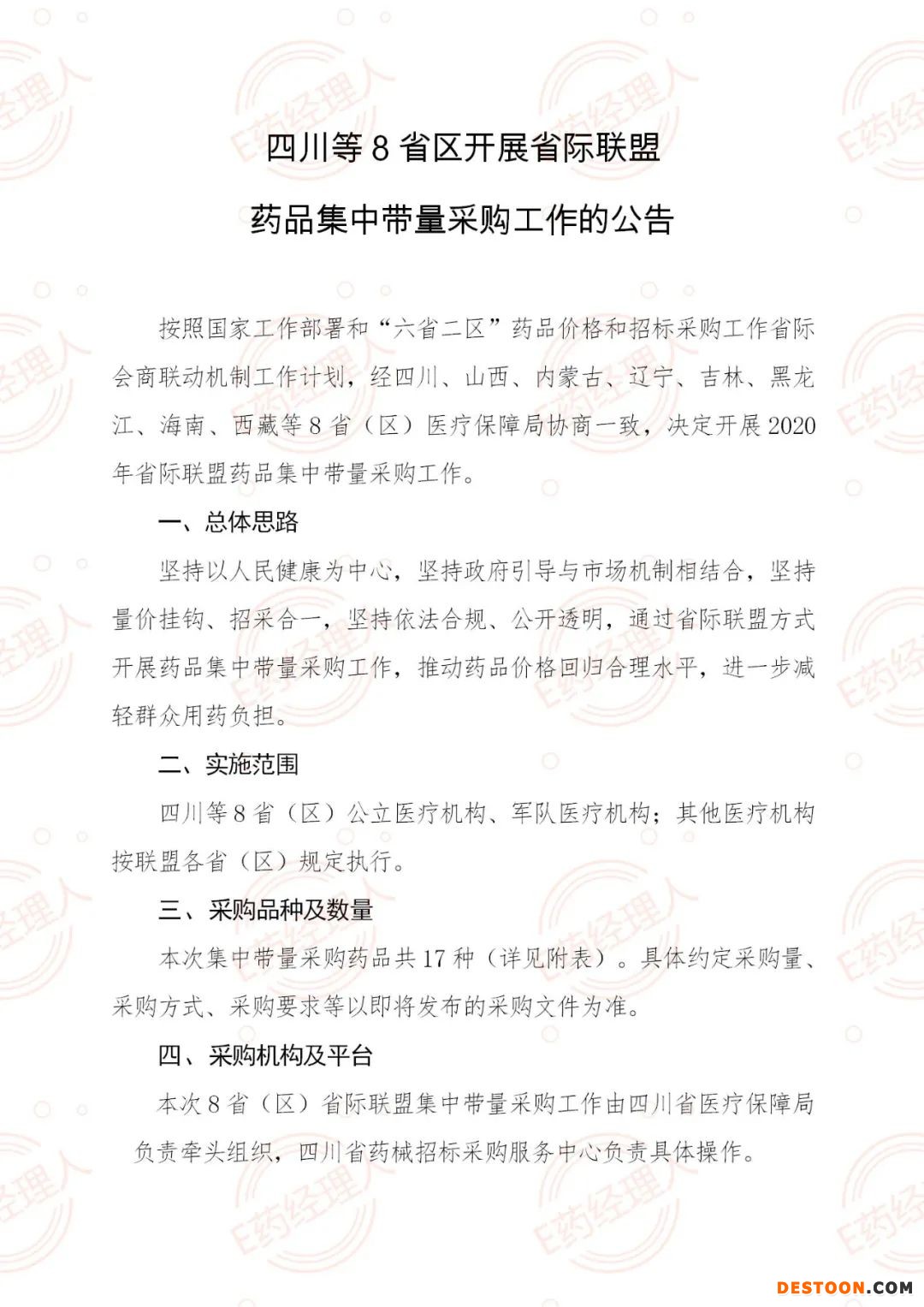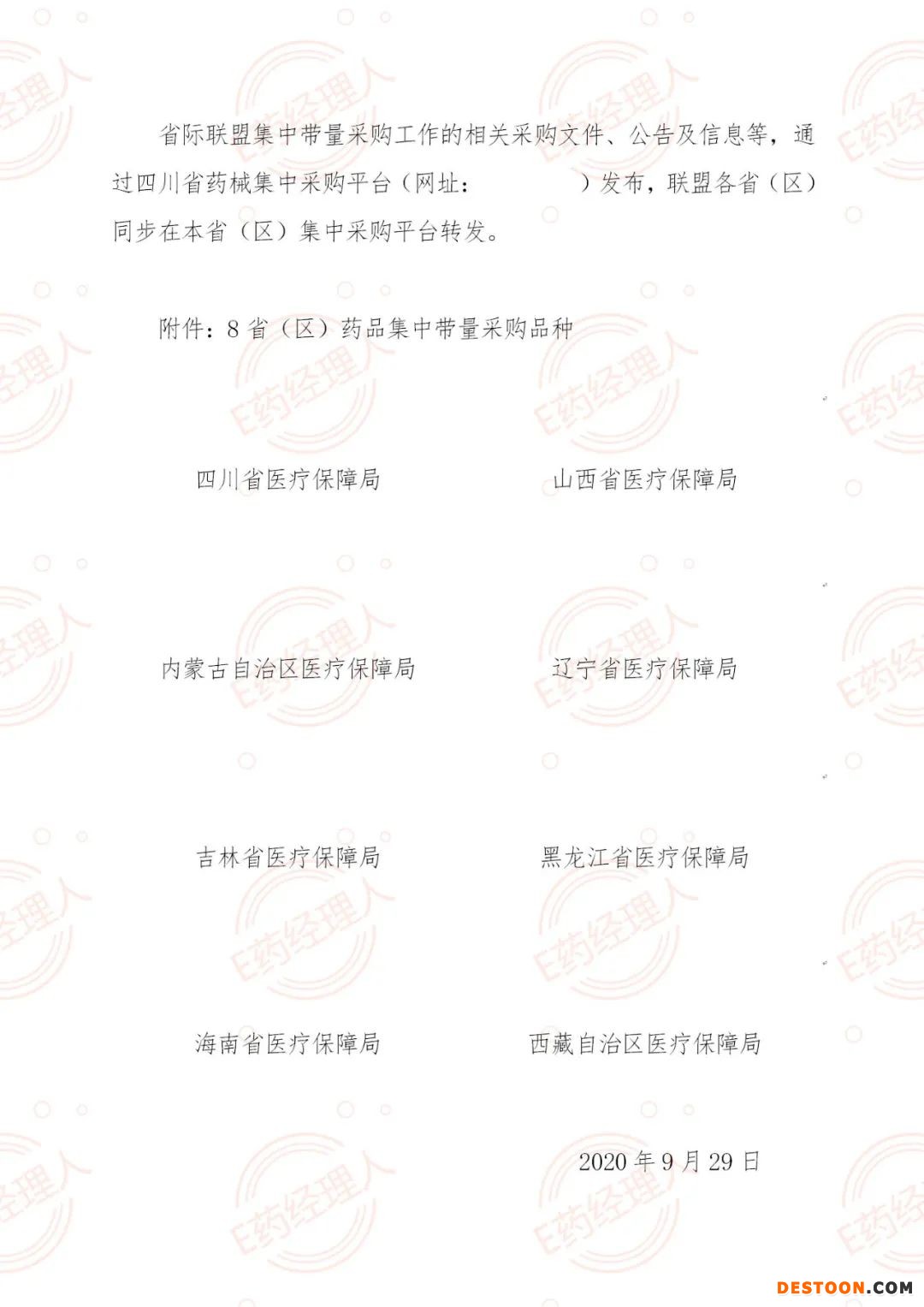 10月9日訊 9月29日,E藥經(jīng)理人從業(yè)內(nèi)獲得一份名為《8省區(qū)開展省際聯(lián)盟藥品集中帶量采購工作的公告》,該公告落款為四川、山西、遼寧、吉林等8省區(qū)的醫(yī)保局,落款日期為9月29日。