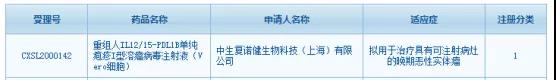武漢濱會生物科技的重組人GM-CSF溶瘤II型單純皰疹病毒(OH2)注射液(Vero細胞)聯(lián)合PD-1/L1治療不可手術切除,標準治療失敗的晚期實體瘤(如乳腺癌、黑色素瘤、頭頸癌、軟組織肉瘤、肝癌或肝轉(zhuǎn)移瘤等)的治療。