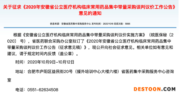 10月10日訊 10月9日,安徽省醫(yī)藥集中采購平臺發(fā)布《關(guān)于征求<2020年安徽省公立醫(yī)療機構(gòu)臨床常用藥品集中帶量采購談判議價工作公告>意見的通知》(以下簡稱“征求意見稿”),將對臨床常用呼吸系統(tǒng)用藥、抑酸藥、肝膽疾病用藥及醫(yī)學影像對比劑四類藥品進行集中帶量采購談判議價,擬談判藥品總數(shù)多達231個。這些藥品將分別選取占2019年度該省公立醫(yī)療機構(gòu)四類采購額前90%的產(chǎn)品,并結(jié)合臨床實際組織專家遴選確定。