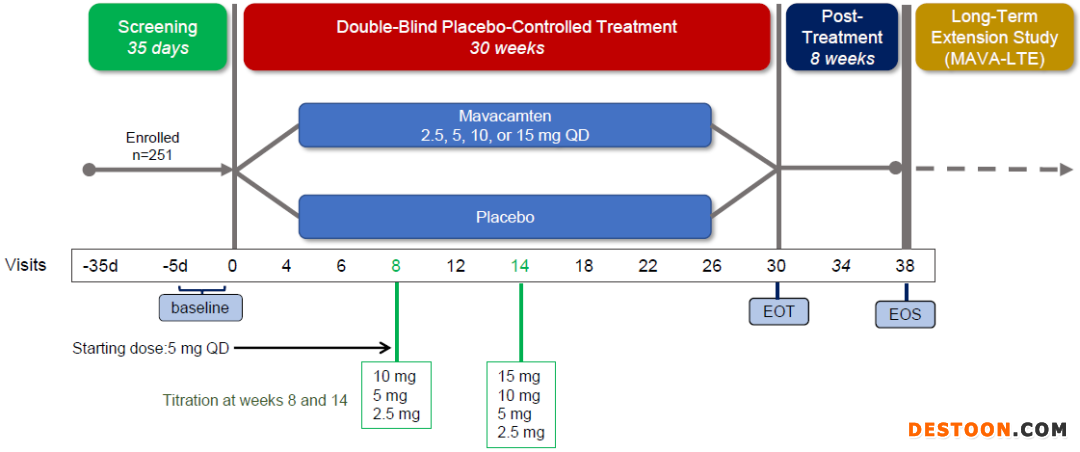在今年8月的歐洲心臟病學會大會(ESC Congress)上,MyoKardia公布了mavacamten的關鍵性III期臨床試驗EXPLORER-HCM(NCT03470545)30周的結果。251例有癥狀梗阻性HCM患者被1:1隨機分成兩組,在30周內每日口服一次mavacamten或安慰劑。全部患者滿足以下入排標準:LVOT梯度≥50mmHg、NYHAclass II-III(紐約心臟協(xié)會II-III級)癥狀、LVEF(左心室射血分數)>55%,允許背景用藥。患者最初每天接受5mg的劑量,在第8周和第14周有兩次機會根據心臟健康的血藥濃度測量將劑量調整到2.5mg和15mg之間。(圖表4)