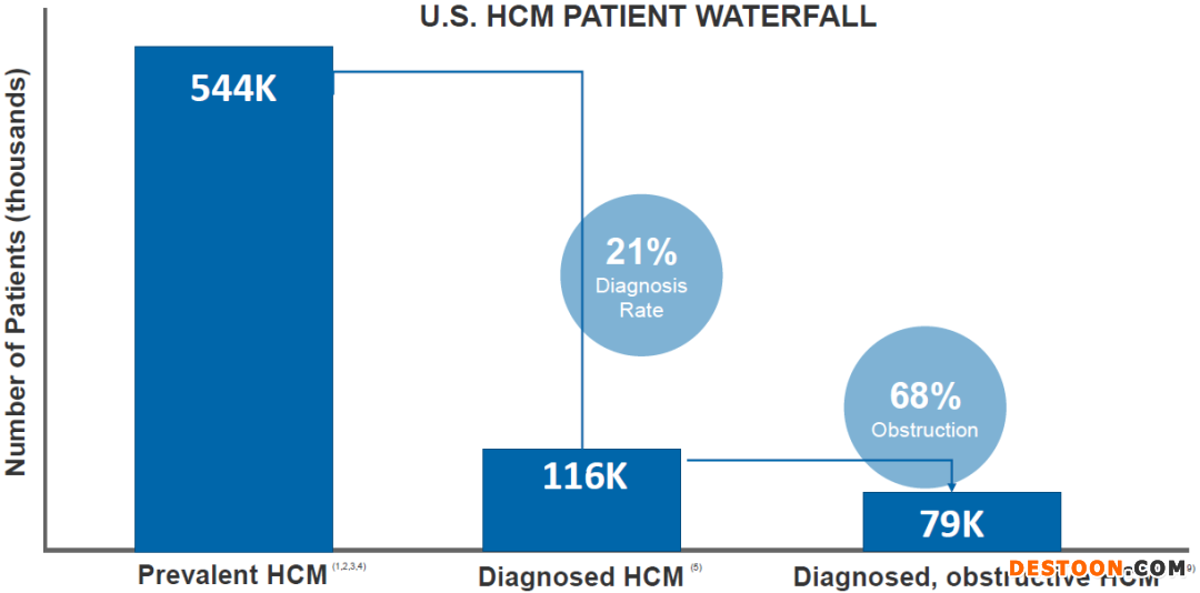 BMS的CEO Giovanni Caforio在電話會議上,堅稱僅憑mavacamten在梗阻性HCM方面的前景,即可證明收購MyoKardia是合理的。Caforio博士認為梗阻性HCM適應癥是一個“幾十億美元的機會”。每500人中就有1人患有HCM,使其成為最常見的遺傳性心血管疾病。在美國和歐盟,目前約有16-20萬人被診斷為有癥狀的梗阻性HCM,據估計只有約25%的梗阻性HCM患者和約10%的非梗阻性HCM患者得到了診斷。以美國為例,估計HCM患者有54.4萬例,但是診斷率僅有21%。可以預見,隨著診斷率的提升,HCM治療市場的容量將會進一步增長。(圖表3)