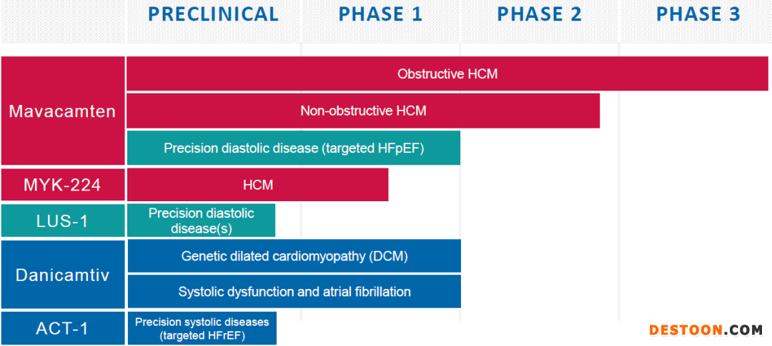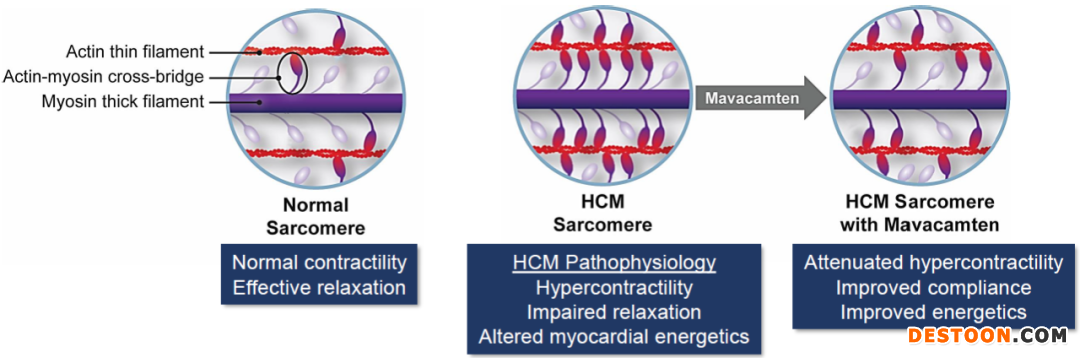 Mavacamten是一類新的直接肌球蛋白抑制劑(myosininhibitor)的首個候選藥物,它針對過度收縮和松弛受損、心肌能量和順應性,旨在治療肥厚性心肌?。℉CM,hypertrophic cardiomyopathy)。MyoKardia已經將mavacamten推進至多項后期臨床研究,觀察其治療梗阻性和非梗阻性HCM的潛力。