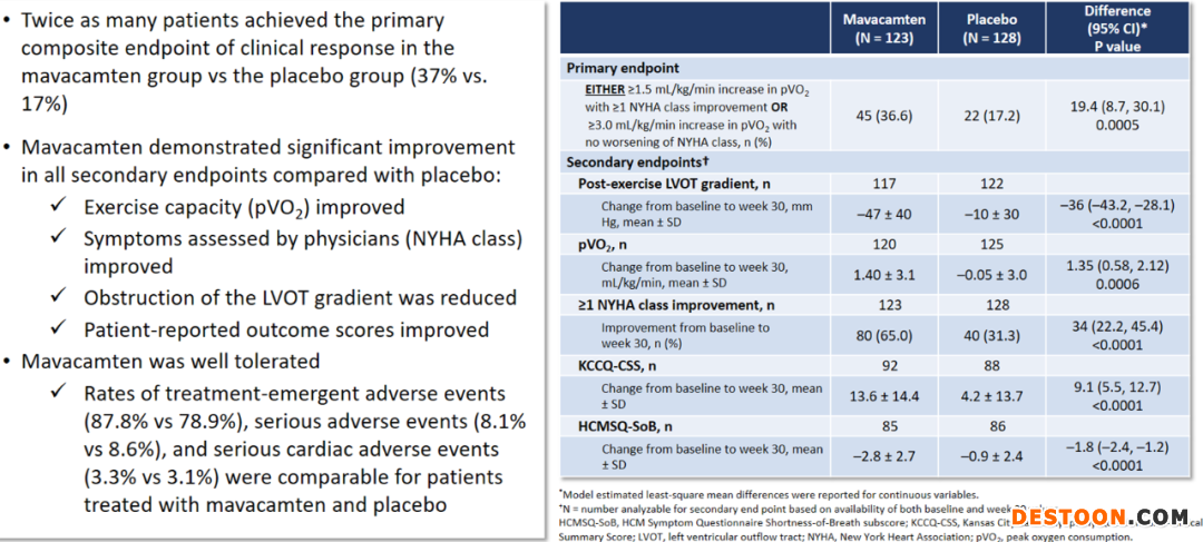 試驗結果顯示,36.6%的隨機接受mavacamten治療的患者達到主要終點,相比之下,接受安慰劑的患者只有17.2%,且統(tǒng)計學差異顯著(p=0.0005)。Mavacamten治療的患者在癥狀、功能狀態(tài)和生活質量的關鍵方面,均有統(tǒng)計學意義和臨床意義的改善,體現為運動能力(pVO2,峰值耗氧量)改善、NYHA級別改善、LVOT阻塞梯度減少,以及患者報告結果分數改善,如KCCQ-CSS(堪薩斯市心肌病問卷-臨床總結評分)和HCMSQ-SoB(HCM癥狀問卷呼吸急促子評分)。除了滿足主要和全部次要終點外,mavacamten的耐受性良好,安全性與安慰劑相似。(圖表5)