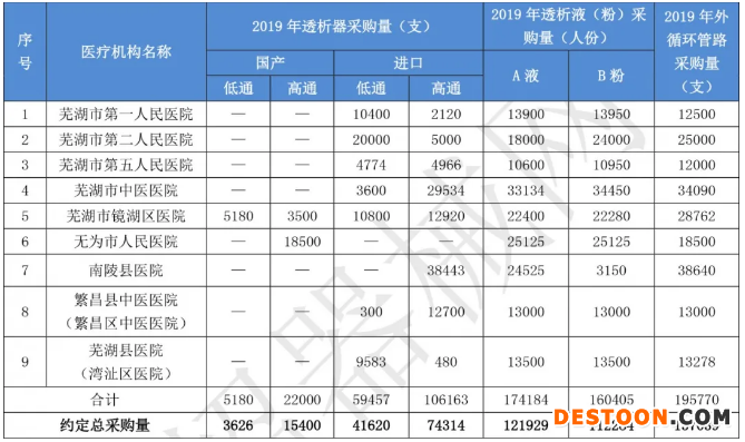 根據(jù)《意見稿》,蕪湖市所有公立醫(yī)療機(jī)構(gòu)將對(duì)血透類醫(yī)用耗材中透析器、透析液(粉)、體外循環(huán)血路三個(gè)品種進(jìn)行帶量采購,采購量不低于全市公立醫(yī)療機(jī)構(gòu)上年度同期該產(chǎn)品采購量的70%(2019年度具體采購量如下),總計(jì)506211支,采購周期為2年。