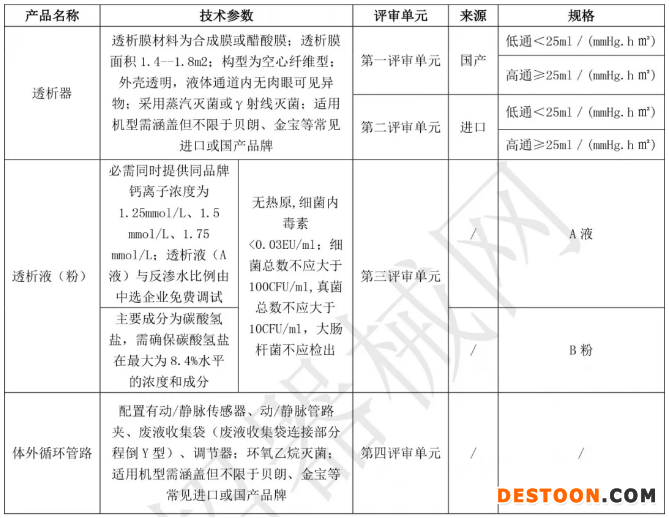 《意見稿》顯示三個(gè)采購品種共分為4個(gè)評(píng)審單元,都明確了技術(shù)參數(shù)需求,其中透析器依據(jù)醫(yī)療器械注冊證分為國產(chǎn)和進(jìn)口兩個(gè)層次,同一層次、同一產(chǎn)品目錄的產(chǎn)品為一個(gè)評(píng)審單元,同一評(píng)審單元視為同一質(zhì)量層次,各評(píng)審單元遴選2家生產(chǎn)企業(yè)。