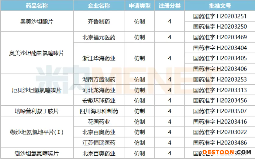 米內(nèi)網(wǎng)數(shù)據(jù)顯示,2020年至今獲批上市的作用于腎素-血管緊張素系統(tǒng)的藥物有11個(gè)(按產(chǎn)品名+企業(yè)統(tǒng)計(jì)),其中奧美沙坦酯氫氯噻嗪片、厄貝沙坦氫氯噻嗪片、纈沙坦氨氯地平片(Ⅰ)、纈沙坦氫氯噻嗪片均屬于血管緊張素II拮抗劑(復(fù)方),涉及華海、方盛、百奧藥業(yè)、恒瑞醫(yī)藥等多家國(guó)內(nèi)明星藥企。