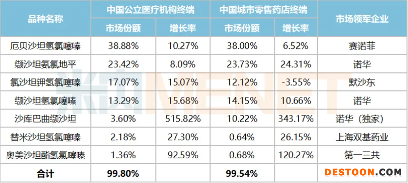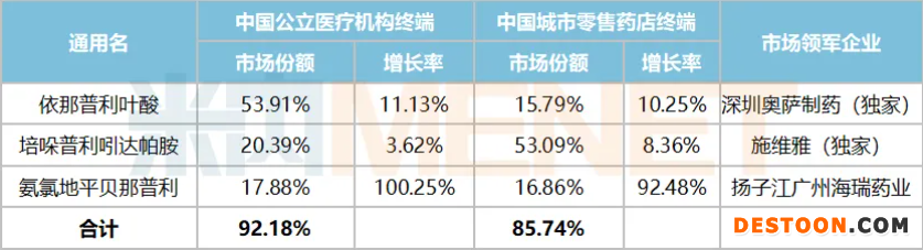 氨氯地平貝那普利目前獲批的國(guó)內(nèi)藥企有揚(yáng)子江以及成都地奧制藥集團(tuán),兩家企業(yè)的產(chǎn)品劑量不一樣,在中國(guó)公立醫(yī)療機(jī)構(gòu)終端揚(yáng)子江稱霸,在中國(guó)城市零售藥店終端則由成都地奧制藥集團(tuán)領(lǐng)軍,但由于醫(yī)院終端銷售體量較大,整體而言揚(yáng)子江仍處于領(lǐng)軍地位。