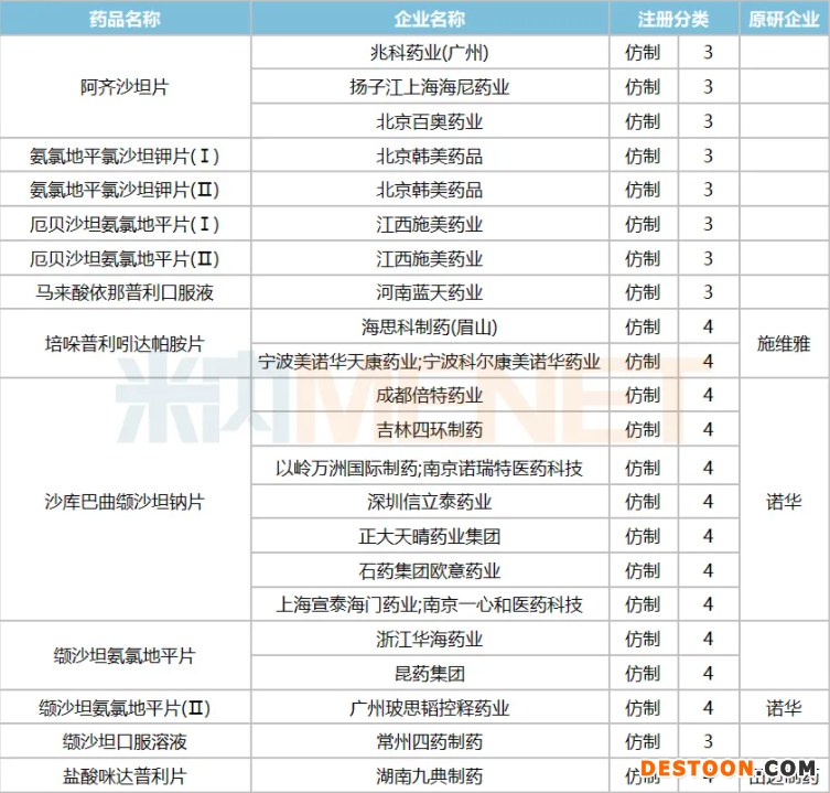 2020年至今,已有恒瑞、北京百奧藥業(yè)、花園藥業(yè)的纈沙坦氨氯地平片(Ⅰ)4類仿制上市申請(qǐng)獲批并視同過評(píng),產(chǎn)品投入市場(chǎng)后將打破諾華獨(dú)占市場(chǎng)的局面,同時(shí)“3仿制+1原研”的格局已經(jīng)形成,若被下一批國(guó)家集采納入目錄,將加速國(guó)產(chǎn)仿制藥分食市場(chǎng)。