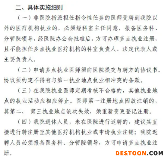 即使?jié)M足了申請條件,在具體實施細則上,文件明確表示,非醫(yī)院指派擔(dān)任指令性任務(wù)的醫(yī)師受聘到外院醫(yī)療機構(gòu)執(zhí)業(yè)的,必須經(jīng)科室主任同意,并報備醫(yī)務(wù)科、分管院領(lǐng)導(dǎo),并經(jīng)醫(yī)院辦公會批準(zhǔn)后,方可辦理多點執(zhí)業(yè)注冊,且不能擔(dān)任多點執(zhí)業(yè)醫(yī)療機構(gòu)的科室負責(zé)人、法人代表或主要負責(zé)人。