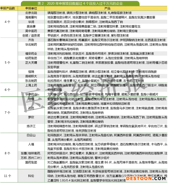 超過20家企業(yè)在2020年申報(bào)的項(xiàng)目數(shù)超過4個(gè)且投入過千萬。普通注射劑以每個(gè)項(xiàng)目200萬~300萬計(jì)算,4個(gè)項(xiàng)目就過千萬;而需要做BE的口服藥一個(gè)項(xiàng)目600萬~1200萬??苽愲m然項(xiàng)目數(shù)目前最多,共11個(gè),但9個(gè)是注射劑,實(shí)際上投入未必高于有復(fù)雜注射劑鹽酸多柔比星脂質(zhì)體注射液的石藥集團(tuán)。