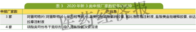 2020年,暫無化學(xué)藥新3類申報(bào)廠家數(shù)超過5家的品種。大部分申報(bào)新3類的還是國(guó)內(nèi)同通用名已有廠家上市的品種,例如美金剛、氟比洛芬、依達(dá)拉奉、奧司他韋和氨溴索。這類品種有可能豁免驗(yàn)證性臨床證據(jù),吸入溶液和注射劑有可能連生物等效性試驗(yàn)也不用做,實(shí)際上所投入的成本和新4類差不多。