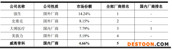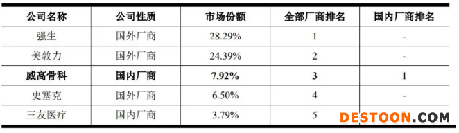 2019年度,威高骨科以5.12%的市場份額,位居骨科植入醫(yī)療器械領(lǐng)域國內(nèi)第4,是唯一進入前5的國產(chǎn)廠商,同時整體市場份額位居國內(nèi)廠商第一,足以窺見其強勁實力。