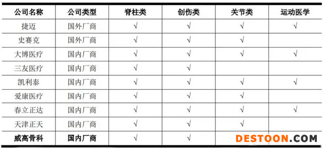 威高骨科是國內(nèi)產(chǎn)品線最齊全的公司,產(chǎn)品覆蓋了創(chuàng)傷、脊柱和關(guān)節(jié)等多個品類,且均有較強的競爭力。