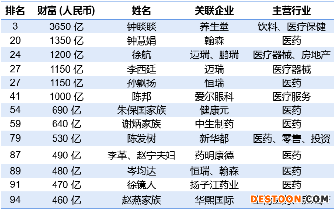 在此次榜單中,醫(yī)藥領(lǐng)域躍升為上榜企業(yè)家最多的第二大行業(yè),總計(jì)超過(guò)200位企業(yè)家上榜,其中位列榜單前一百的醫(yī)藥企業(yè)家財(cái)富總值超過(guò)1.3萬(wàn)億元。