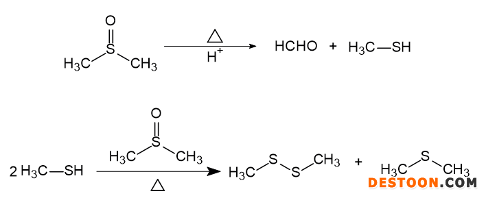 查詢二甲基亞砜穩(wěn)定性相關文獻,報道二甲基亞砜在酸性條件下高溫加熱會發(fā)生分解,分解產(chǎn)物主要是甲硫醚(沸點38℃)、二甲基二硫醚(沸點109℃)和甲硫醇(沸點123℃)。