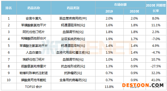 表1:2020E零售終端城市實體藥店處方藥TOP10品種排名及增長趨勢