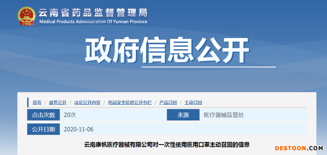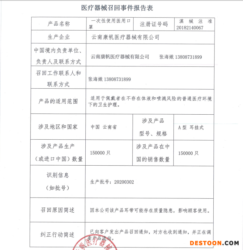 故云南康帆醫(yī)療器械有限公司對(duì)其生產(chǎn)的一次性使用醫(yī)用口罩(批號(hào):20200302)主動(dòng)召回,此次共計(jì)召回口罩150000只,召回級(jí)別為三級(jí)。