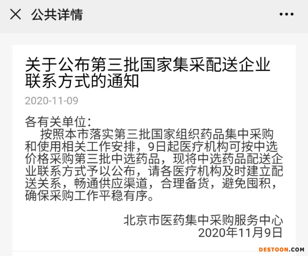 11月9日,北京市藥品陽光采購微平臺(tái)發(fā)布《關(guān)于公布第三批國家集采配送企業(yè)聯(lián)系方式的通知》。