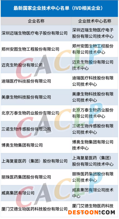 截至目前,已經(jīng)超過1500家企業(yè)被認(rèn)定為國家企業(yè)技術(shù)中心,根據(jù)CACLP統(tǒng)計,加上擬認(rèn)定的2家企業(yè),已有12家體外診斷相關(guān)企業(yè)列入"國家企業(yè)技術(shù)中心"名單。
