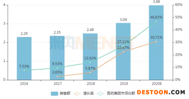 近幾年來,中國城市零售藥店終端血塞通膠囊劑(軟膠囊劑占比超7成)銷售額逐年上漲,增速持續(xù)提升。昆藥集團(tuán)在該品種中的市場份額逐年提升,2020年占比將突破40%,替代昆明華潤圣火藥業(yè)成為領(lǐng)軍企業(yè)。