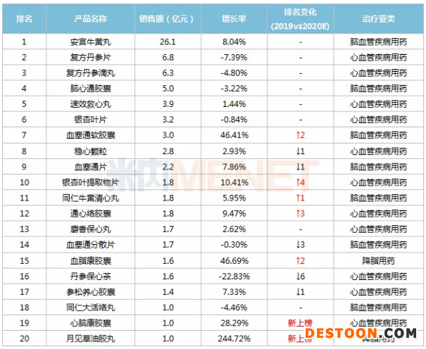表1:2020E中國城市零售藥店終端心腦血管中成藥TOP20產(chǎn)品