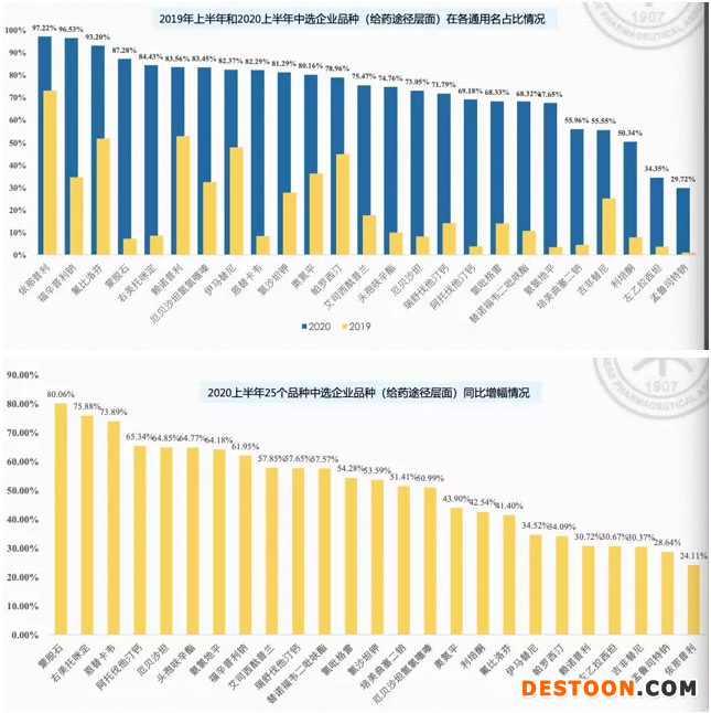 另外,各品種中選企業(yè)的供應(yīng)量占比在2020年上半年有明顯增幅,其中蒙脫石同比增幅80.06%、右美托咪定同比增幅75.88%,恩替卡韋同比增幅73.89%,阿托伐他汀鈣同比增幅65.34%,厄貝沙坦同比增幅64.85%,頭孢呋辛酯同比增幅64.77%??梢钥闯?,各省份帶量采購(gòu)政策實(shí)施效果顯著。