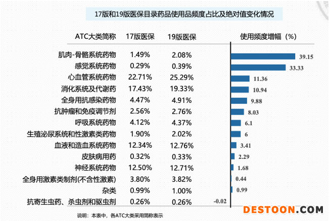 以2020年上半年數(shù)據(jù)為基礎(chǔ),對(duì)比17版與19版醫(yī)保藥品目錄,整體品種數(shù)增幅12.77%,其中腫瘤免疫調(diào)節(jié)藥品品種增幅達(dá)64.44%,心血管系統(tǒng)藥物品種增幅達(dá)20.18%,肌肉-骨骼肌系統(tǒng)藥物品種增幅達(dá)15.91%,全身用激素類制劑品種增幅達(dá)15.39%。