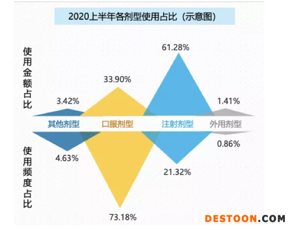 《報(bào)告》指出,2020年上半年,全藥不同劑型中,注射劑型使用金額占比最高,達(dá)61.28%;口服劑型使用頻度占比最高,達(dá)73.18%。