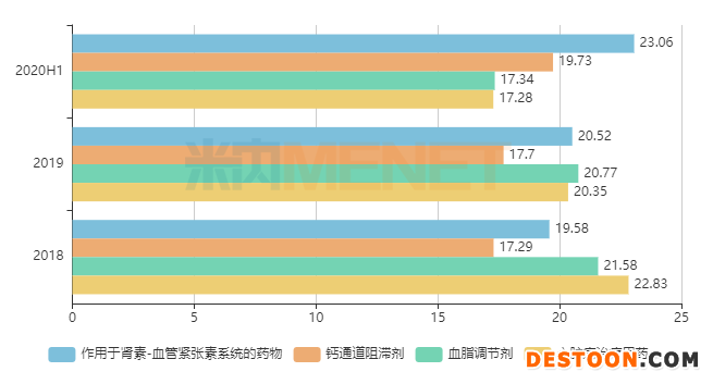 從最近三年的情況來看,2018年心臟病治療用藥以22.83%的份額登頂,血脂調(diào)節(jié)劑也占了21.58%;2019年血脂調(diào)節(jié)劑沖上了TOP1,作用于腎素-血管緊張素系統(tǒng)的藥物市場份額也沖破20%,心臟病治療用藥被擠在了TOP3的位置;2020上半年,作用于腎素-血管緊張素系統(tǒng)的藥物成為了最新的榜首,其余三大亞類的市場份額均在20%以下。