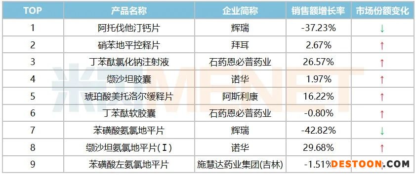 從品牌的情況來看,2019年超10億品牌有22個,其中14個在2020上半年銷售額增速為負值,能堅持下來的都是真英雄。2020H1銷售額破10億的品牌有9個,其中國產(chǎn)品牌占了3個席位。石藥的獨家產(chǎn)品丁苯酞氯化鈉注射液、丁苯酞軟膠囊,以及施慧達的苯磺酸左氨氯地平片榜上有名,三個產(chǎn)品的市場份額均比2019年得到提升,從銷售額增速來看,丁苯酞氯化鈉注射液高達26.57%。