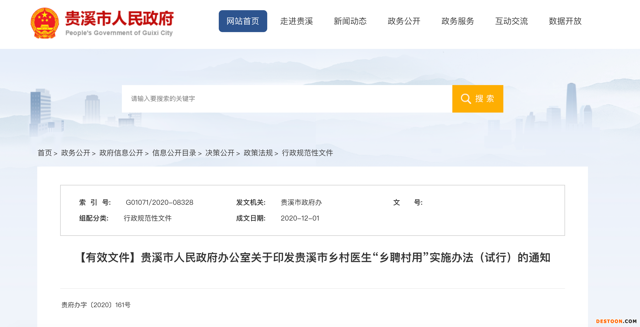 12月1日,江西省貴溪市人民政府辦公室發(fā)布《關(guān)于印發(fā)貴溪市鄉(xiāng)村醫(yī)生“鄉(xiāng)聘村用”實(shí)施辦法(試行)的通知》(以下簡(jiǎn)稱《辦法》)。