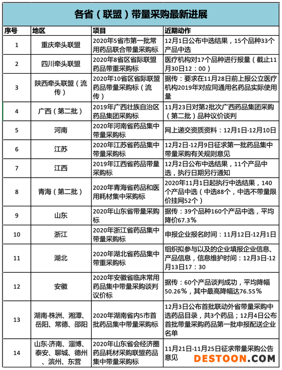 而縱覽其余各?。?lián)盟)開展的藥品帶量采購開展情況,各自進度不一。不過臨近年末,近期各地集采動態(tài)增多。據(jù)業(yè)內(nèi)消息,醫(yī)藥大省山東的首批藥品帶量采購日前公布報價結(jié)果,整體價格下降67.3%、最高降幅98.6%。而由重慶牽頭的五省市第一批常用藥品聯(lián)合帶量采購結(jié)果也在近期浮出水面,15個品種33個產(chǎn)品成功中選。近期值得關(guān)注的還有正在組織擬參與企業(yè)填報信息的湖北33個注射劑帶量采購,以及對第一批藥品集中帶量采購有關(guān)規(guī)則征求意見的江蘇。