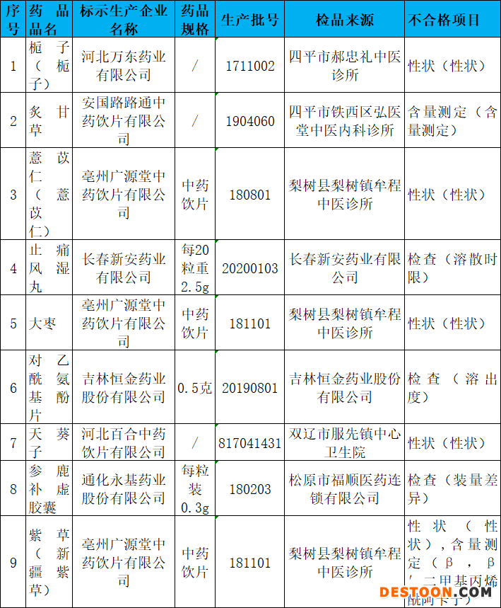 12月3日,吉林省藥監(jiān)局2020年第2期藥品質量公告。公告顯示,有9批次藥品不符合規(guī)定,其中有3批次為制劑,分別為止痛風濕丸、對乙酰氨基酚片、參鹿補虛膠囊,其余全為中藥材及其飲片。