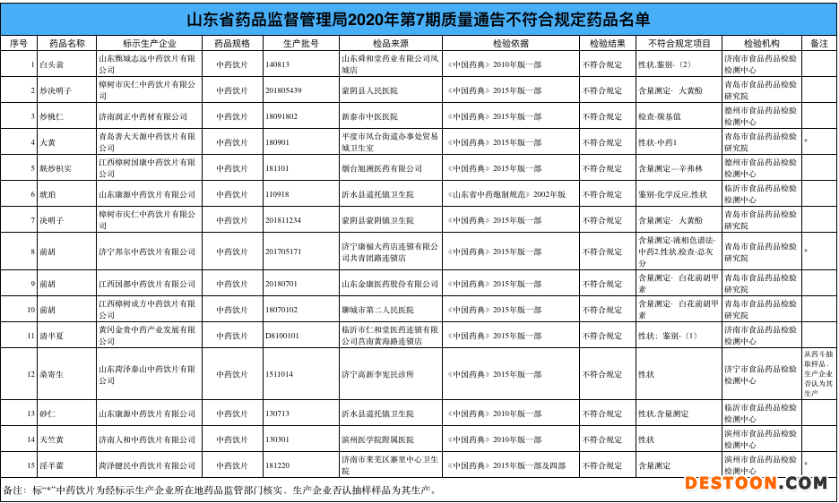 12月10日訊 12月8日,山東省藥品監(jiān)管局發(fā)布2020年第7期藥品質(zhì)量抽檢公告,15批次藥品被查不合格。