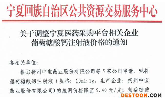 12月14日訊 12月11日,寧夏回族自治區(qū)公共資源交易網(wǎng)發(fā)布《關(guān)于調(diào)整寧夏醫(yī)藥采購平臺(tái)相關(guān)企業(yè)葡萄糖酸鈣注射液價(jià)格的通知》。由揚(yáng)州中寶藥業(yè)、天津金耀藥業(yè)和武漢久安藥業(yè)等5家藥企生產(chǎn)的葡萄糖酸鈣注射液(規(guī)格10ml:1g)均在該省申請(qǐng)降價(jià),其中上海浦津林州制藥的掛網(wǎng)價(jià)格最低,降至7.60元/支,河北天成藥業(yè)的掛網(wǎng)價(jià)最高,降價(jià)后為12.15元/支。