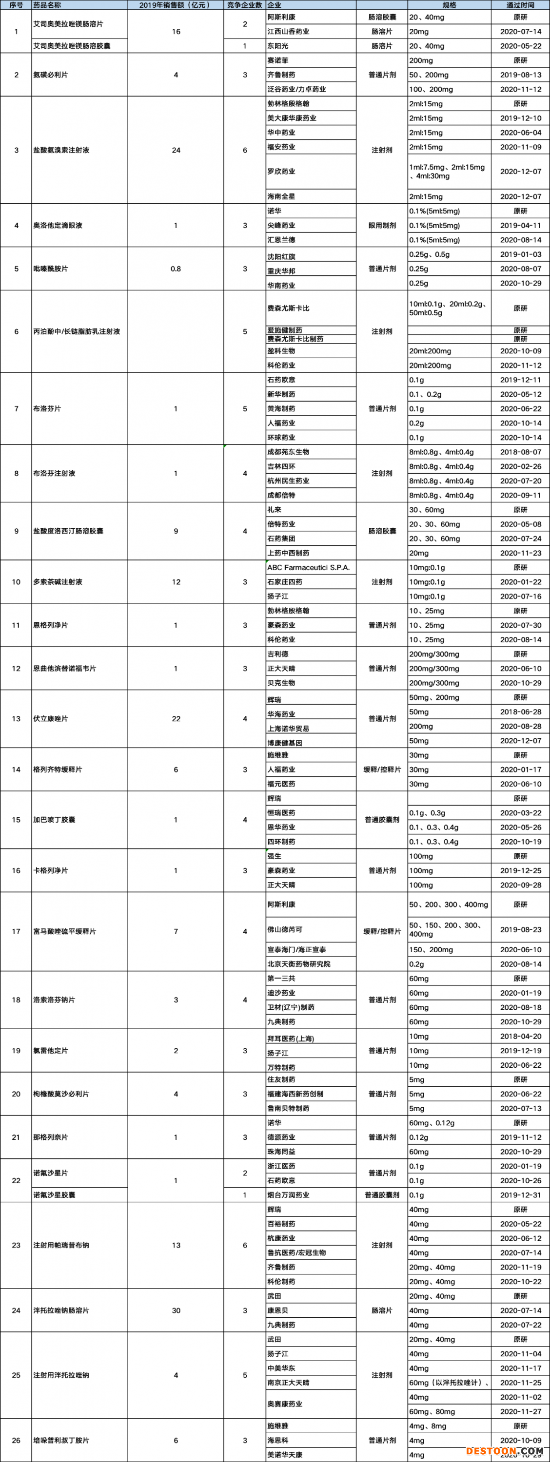 與此同時(shí),石藥也有6個(gè)品種進(jìn)入,分別是布洛芬片、鹽酸度洛西汀腸溶膠囊、諾氟沙星片、注射用硼替佐米、鹽酸普拉克索片、替格瑞洛片。接下來的正大天晴、豪森、東陽光、科倫等,涉及品種分別為6、4、3、3。