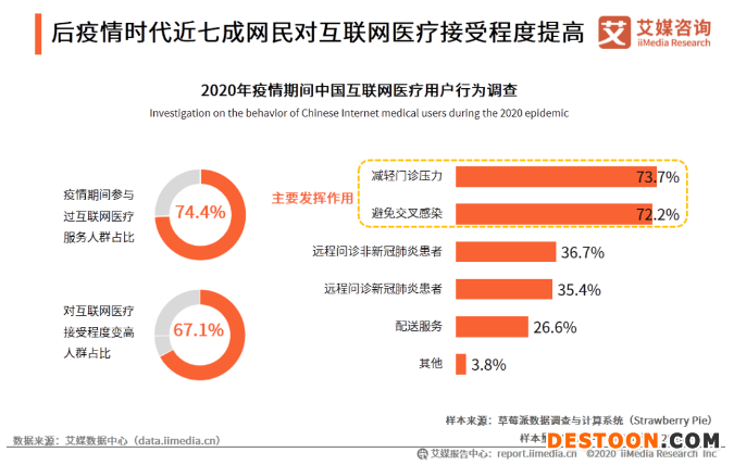 2020年新冠疫情影響下,居民對于醫(yī)藥電商、互聯(lián)網(wǎng)醫(yī)療平臺使用需求進一步提升。艾媒咨詢數(shù)據(jù)顯示,74.4%的中國網(wǎng)民在疫情期間參與過在線問診、醫(yī)藥電商或互聯(lián)網(wǎng)健康咨詢等互聯(lián)網(wǎng)醫(yī)療服務,67.1%的網(wǎng)民表示對互聯(lián)網(wǎng)醫(yī)療接受程度有所提升。
