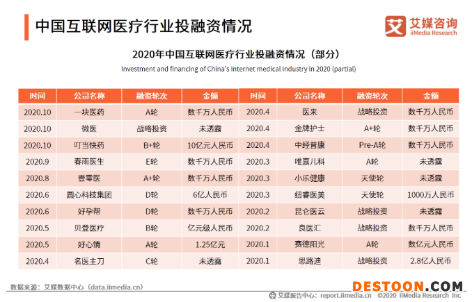 疫情背景下,互聯(lián)網(wǎng)醫(yī)療作為重要發(fā)展方向,更受資本青睞。今年以來,尤其是在疫情期間,互聯(lián)網(wǎng)巨頭加大投入在互聯(lián)網(wǎng)醫(yī)療方面的布局。2020年1月至10月,醫(yī)療健康領域融資金額超過500億元,互聯(lián)網(wǎng)醫(yī)療行業(yè)競爭進入白熱化。
