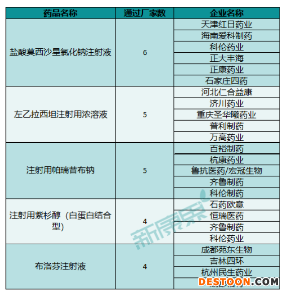 不過,申報數(shù)量較多并不代表過評幾率就一定高。從已通過(或視同通過)一致性評價的注射劑品類來看,跟申報品種并沒有太多交集。按照通過(或視同通過)廠家數(shù)的排名看,鹽酸莫西沙星氯化鈉注射液有6家通過,左乙拉西坦注射用濃溶液有5家,注射用帕瑞昔布鈉有5家。